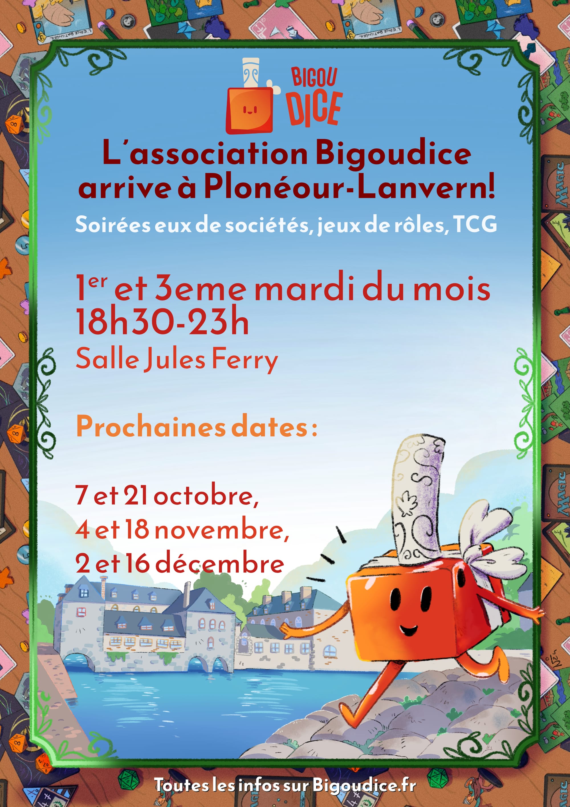 On est heureuses et heureux de vous annoncer que Bigoudice étend ses activités et va désormais proposer des soirées jeux le 1er et 3eme mardi du mois à Plonéour-Lanvern. Les séances auront lieu de 18h30 à 23H sur le même modèle que celles de Pont l'abbé à la salle Jules Ferry (22 rue Jules Ferry, à plonéour).